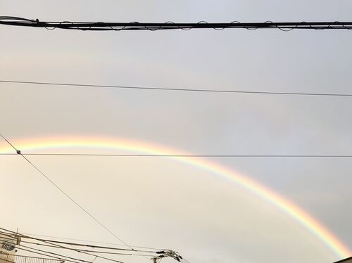 本日、夕刻の空を見上げた人も多かろうと思う。くっきりと色鮮やかに浮かんだ、ほんの10分ほどの光景。こんなに近く、大きく、綺麗なアーチを描いた虹は、初めてかもしれない。私は、馴染みの店でカット&カラー中。幸運にもシェービングが一段落したところ…